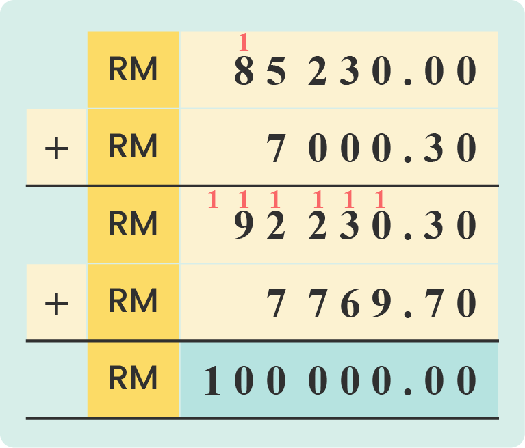 RM 85 230 + RM 7 000.30 + RM 7 769.70 = RM100 000.00