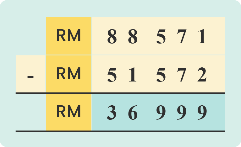RM 88 571 - RM 51 572 = RM 36 999