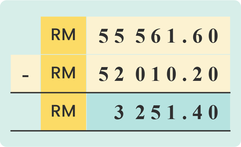 RM 55 561.60 - RM 52 010.20 = RM 3 251.40