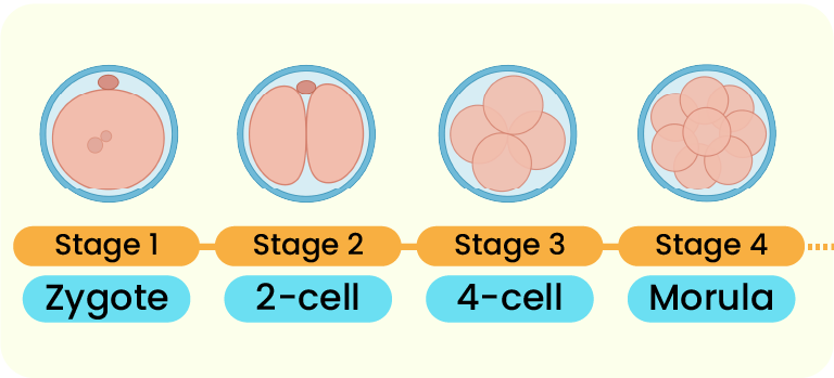 The first cell division produces a two-cell embryo. The following cell divisions will finally produce a morula.