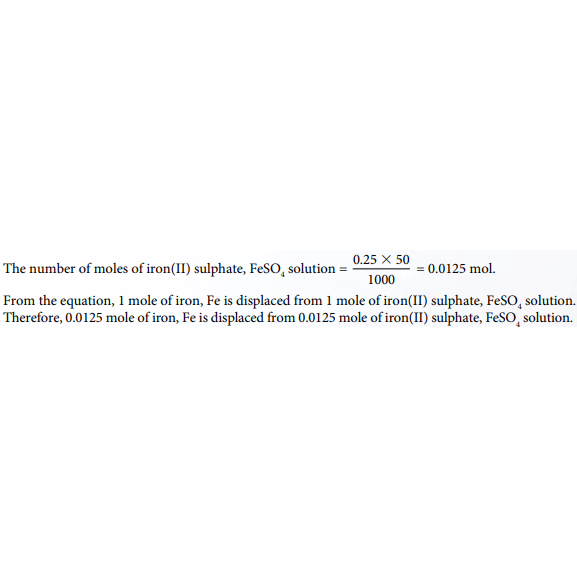 Step 2: Calculate the number of moles of iron, Fe displaced from iron(II) sulphate, FeSO4 solution
