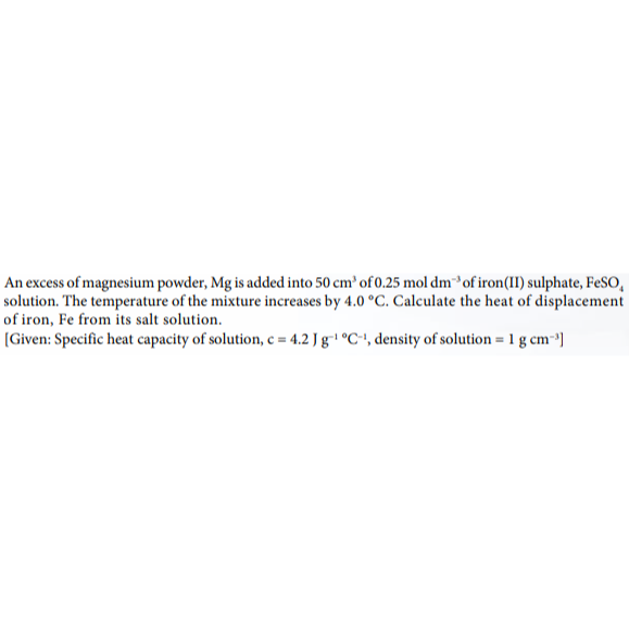 Steps to calculate the heat of displacement of iron, Fe from its salt solution