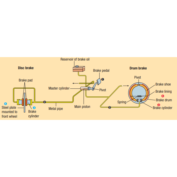 This pressure pushes the piston in the brake cylinder which presses the brake pad onto the steel plate in the disc brake