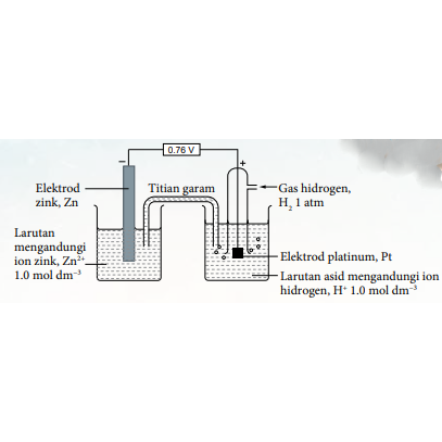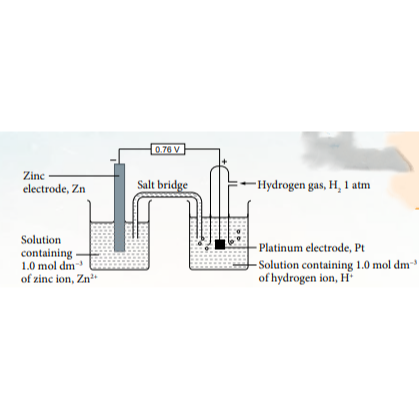 Since the standard hydrogen potential is 0.00 V, the voltmeter reading of 0.76 V shows the electrode potential of zinc